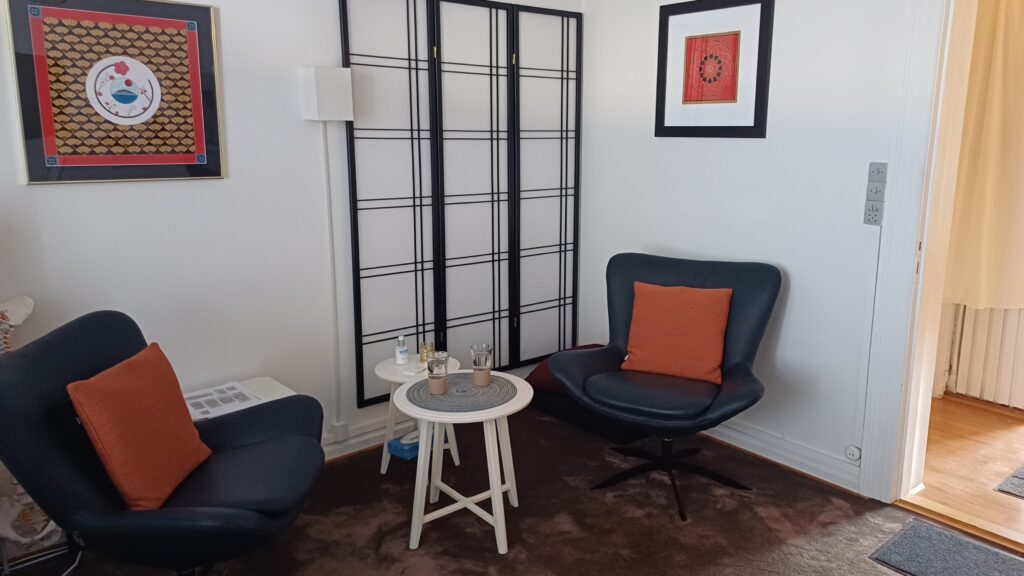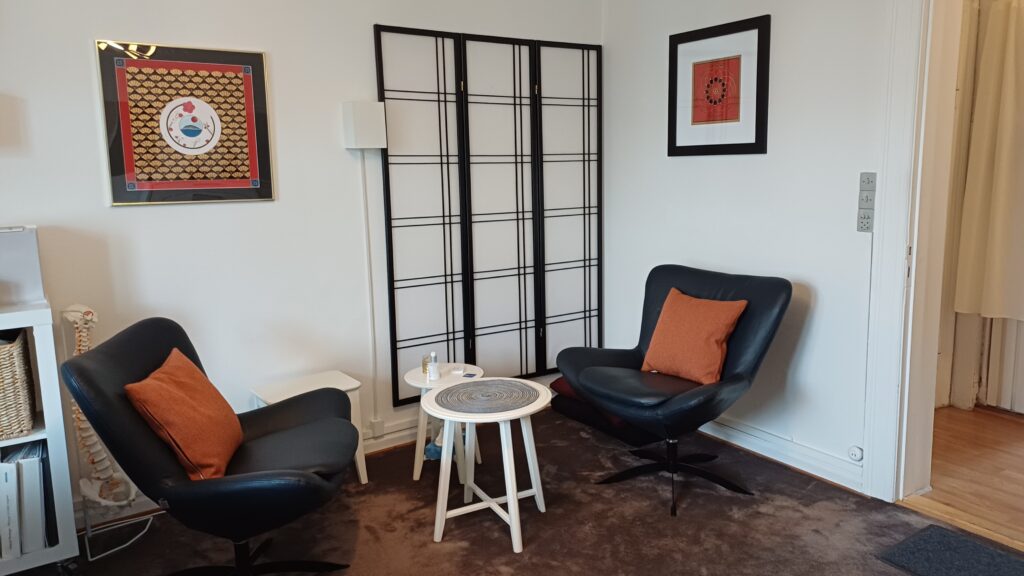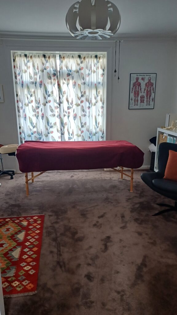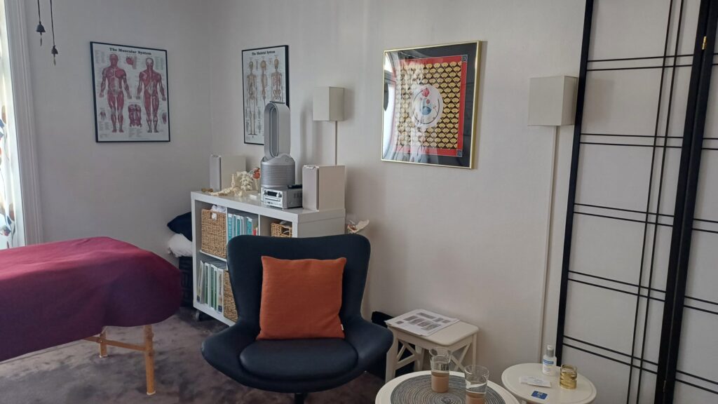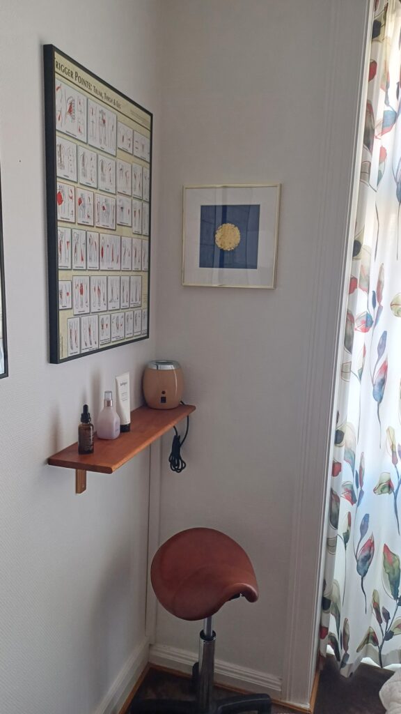 Jeg er en del af et dejligt klinikfællesskab med en akupunktør “Dragon Rises” og en samtaleterapeut. Vi har hver vores egne lokaler.